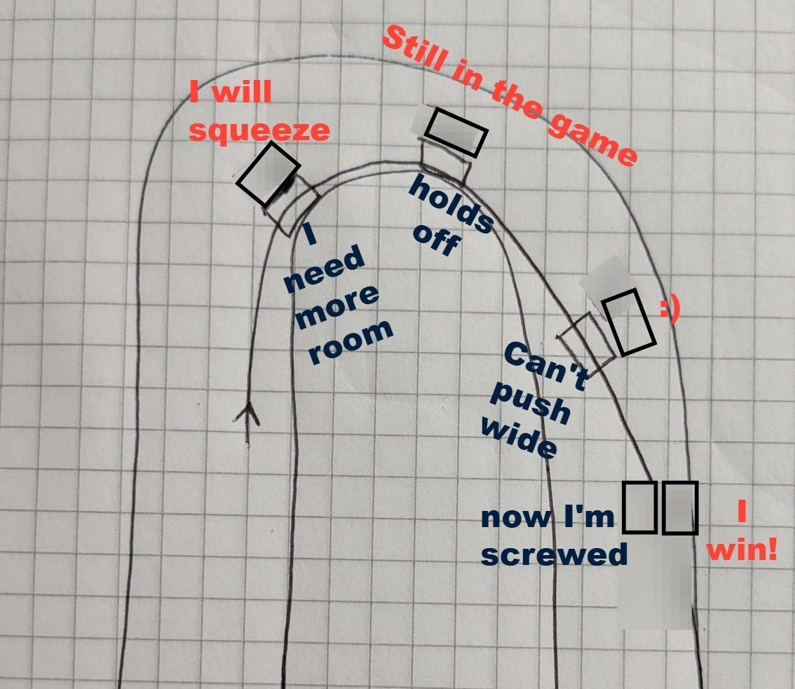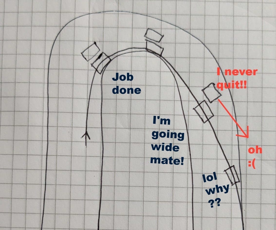 If however, you are over-generous with racing room (perhaps from watching too much F1 - an inferior form of racing) and you lift a bit at the apex, possibly from feeling like you might touch your opponent, then they have a reasonable chance of staying on your outside, level with you.